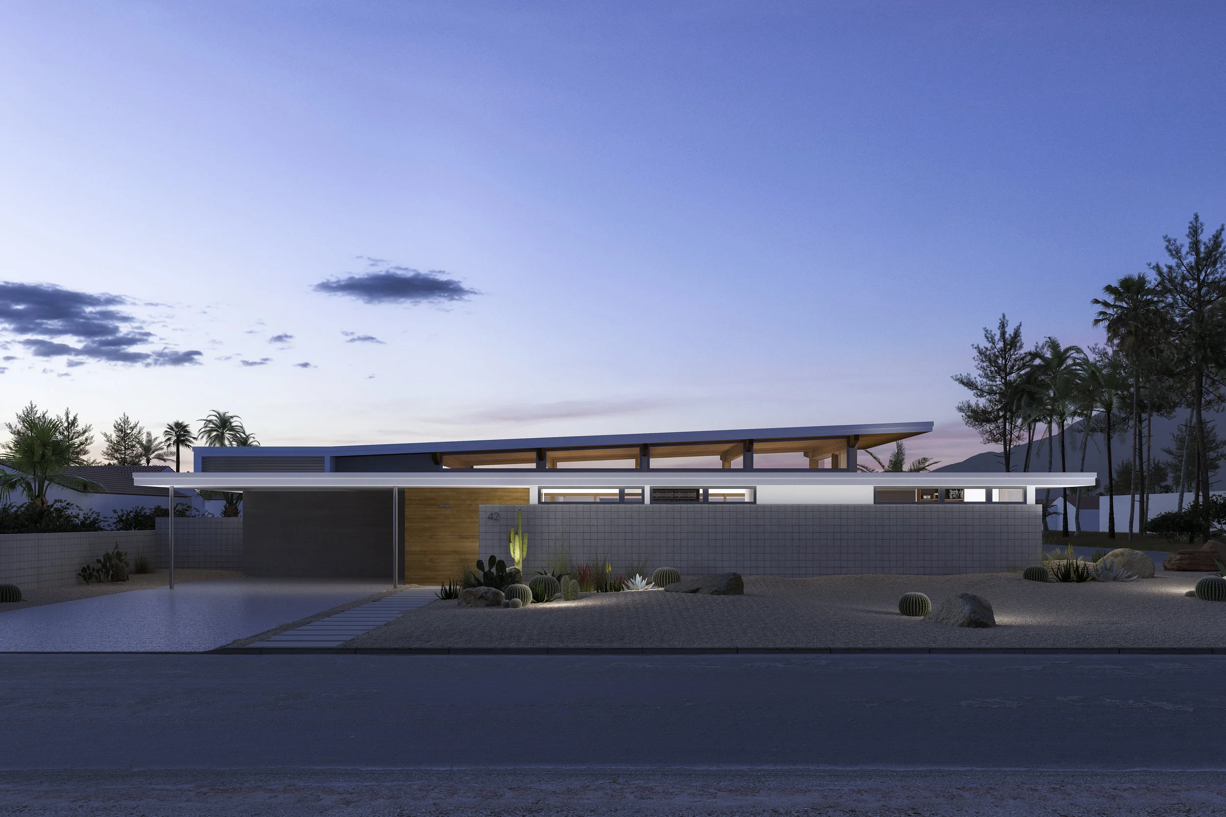 Using a digital 3D model, we created an exterior siding and cladding visualization study—looking at the house with three possible siding/cladding options. Because of the hot, dry Palm Springs summers, the best choice for the exterior facade was a combination of stucco, concrete block, and thermally modified wood.