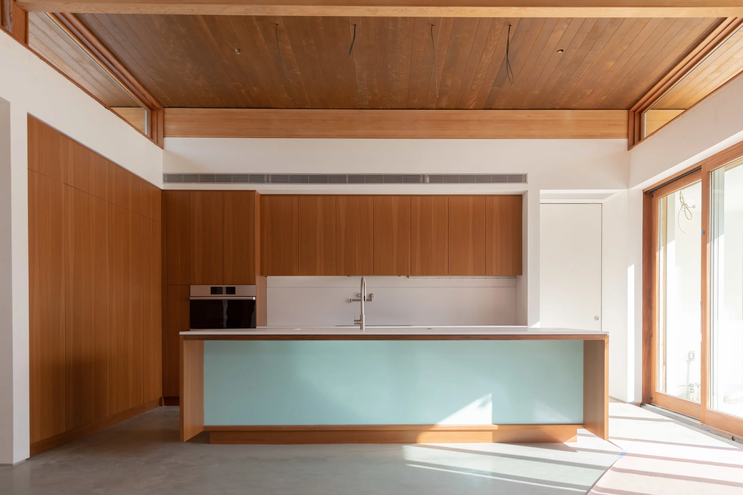 While the cantilevered roof is a sight to see on its own, it also serves various important functions—some of which will allow us to achieve net-zero energy. As shown in the second and third photos captured by 22 Waves for Dwell, the roof directly above the great room’s footprint is carefully lined with a photovoltaic system made up of 36 solar panels from Hot Purple Energy, which also acts as a cooling mechanism by shading the reflective roof membrane sitting just a few inches below it. We also carefully designed the roof overhangs to prevent direct sunlight from hitting the windows during the hot summer months. Everything has a purpose!