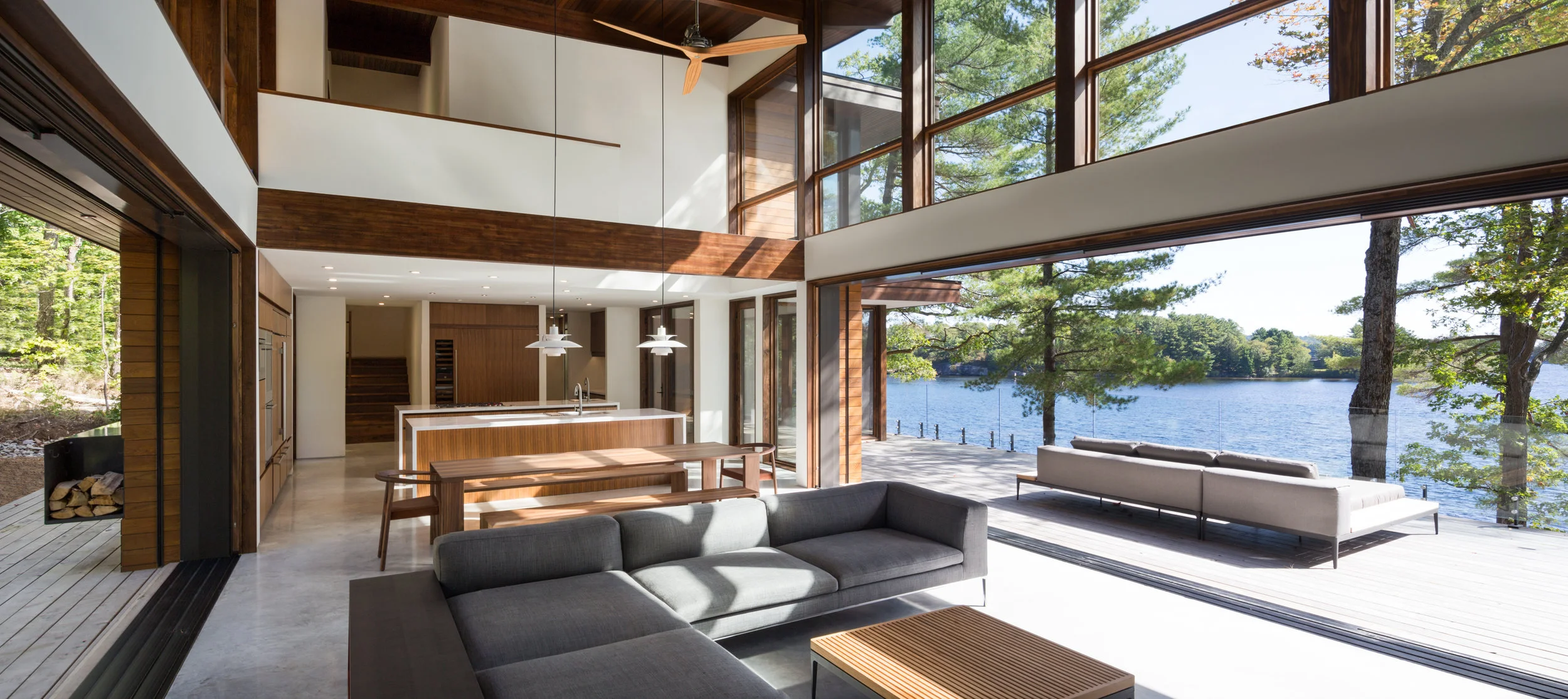 Designed to celebrate magnificent lake views from the moment of arrival, Muskoka Cottage is wide open on both sides, with expansive windows, an open floor plan, and two 24-foot-wide retractable walls of glass that tuck into pockets—connecting the double-height space with its natural surroundings and elevating views among the tree canopies.